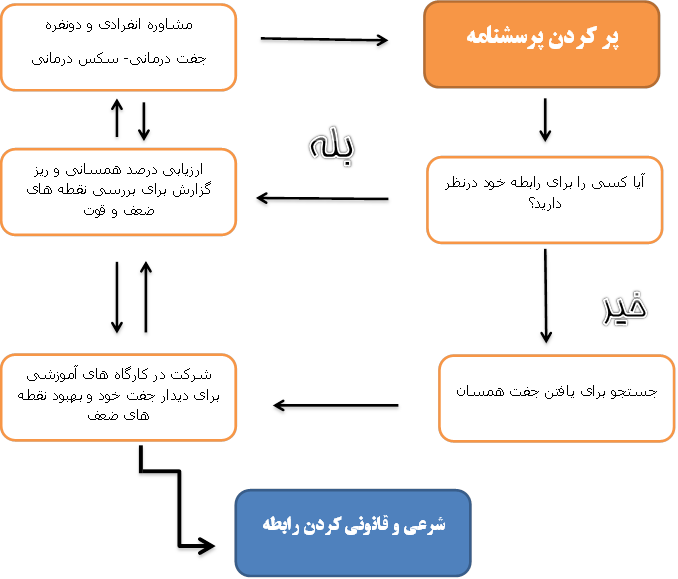 2) اگر شما اکنون دارای جفت نیستید به کمک "جستجوگر تارنما" میتوانید در گروه های دلخواه اندازه همسانی دیگران با شما را شمارش و نشان دهد و در کارگاه های آموزشی درکنار آموختن پایه های یک پیوند پایدار میتوانید از نزدیک با جفت همسان و دلخواه خود دیدار کنید و آنگاه به ارزیابی ویژگی های خود برابر گزارش های گفته شده بپردازید.